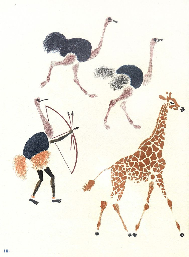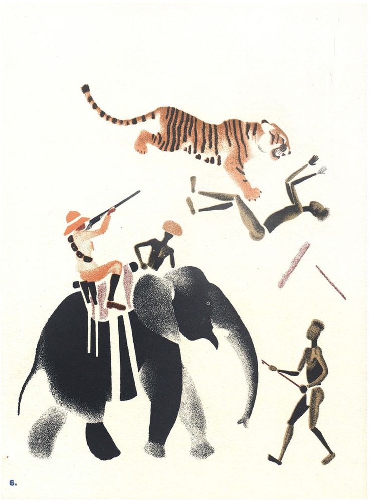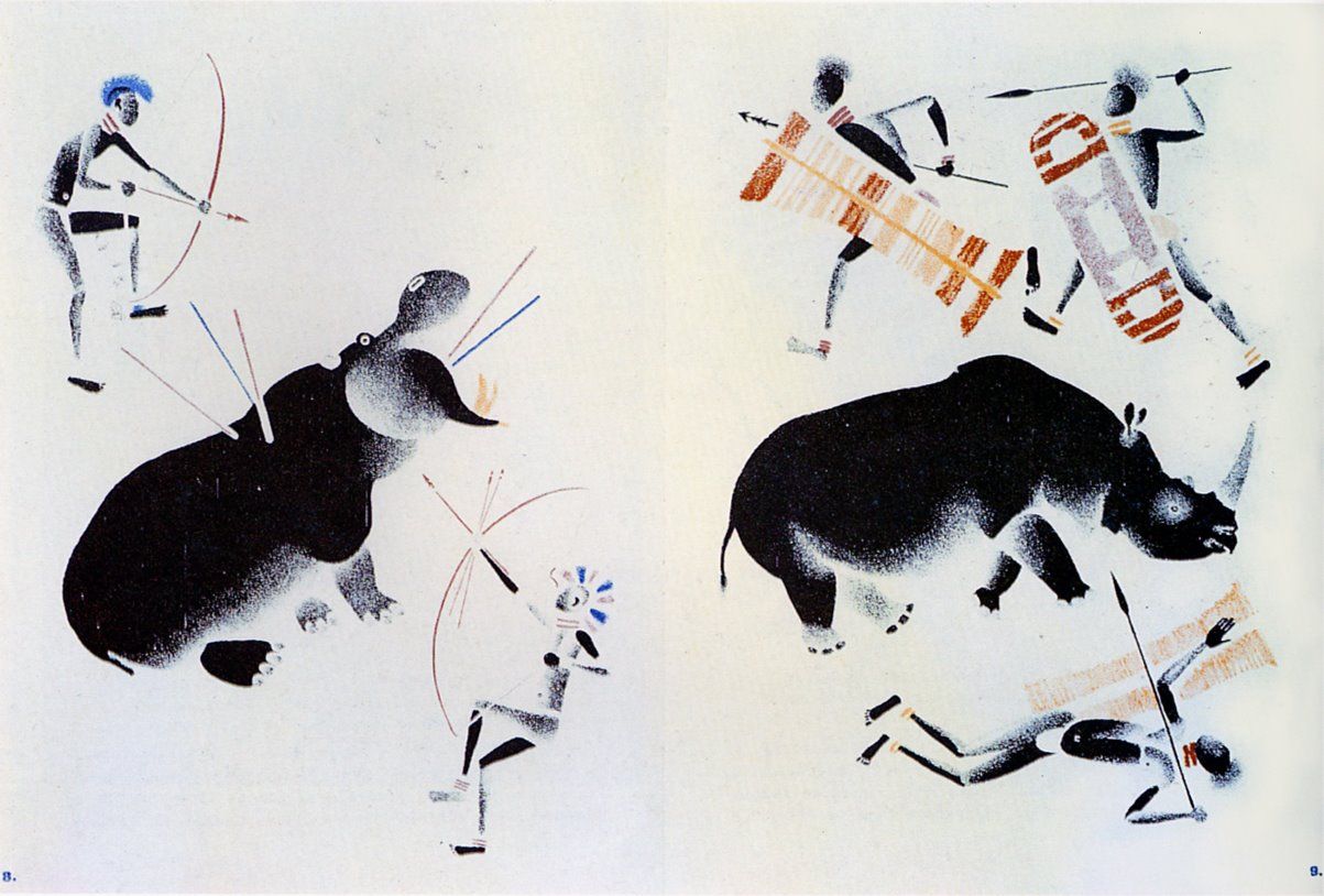 У В. Лебедева есть книга «Охота», изданная в издательстве «Радуга» в 1925 г. Это книга без текста. Но рисунки в ней говорят о многом, хотя выполнены очень лаконично, с минимальным цветовым разнообразием. Цвет коричневый, черный, синий с оттенками голубого, темновато-желтый. Такой подбор цвета подчеркивает драматические коллизии, возникающие на охоте. Но фигуры охотников, зверей, животных, живущих рядом с человеком, столь выразительны, столь искусно расположены и вырисованы на белом листе бумаги, что перед глазами того, кто рассматривает их, будь то взрослый или ребенок, возникает яркая картина противоборства человека и зверя, силы и разума, борьбы за жизнь, которая одинаково дорога всем. И хотя фигуры стилизованы — лиц охотников мы не видим вовсе, а изображение животных плоскостное, — анатомия их передана так четко, так правильно, в соответствии с ситуацией, в которую попадают герои книги, что нет сомнения в реальности происходящего, в напряженнейшем и опасном характере борьбы между человеком и животным. Остается только пожалеть о том, что «Охота» давно не переиздавалась, а так рисовать животных сейчас некому. Да и слово «рисовать» мне кажется здесь не совсем точным, слишком простым для Лебедева. Это создание картины, это проживание запечатленного кистью события, это палитра чувств, событием вызванных.