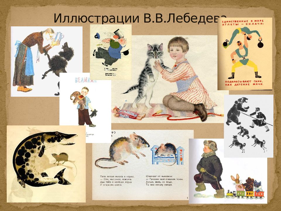 В число наиболее известных книг, проиллюстрированных В. Лебедевым, входят, прежде всего, книги написанные поэтом Самуилом Маршаком: «Цирк», «Мороженое», «Сказка о глупом мышонке», «Усатый полосатый», «Разноцветная книга», «Двенадцать месяцев», «Багаж».