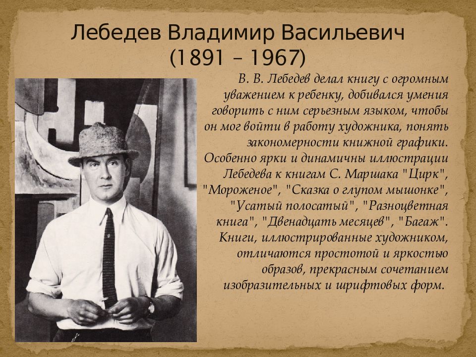 Владимир Васильевич Лебедев (1891-1967) родился в Санкт-Петербурге в семье механика. Именно в семье он научился ценить умение человека работать, быть профессионалом. Сам выучился многим ремеслам, имел глубокие и разносторонние профессиональные знания. В рисовании любил точность, тщательно изображал каждую деталь. Особенно в том случае, когда это касалось машин. Здесь они с Маршаком были очень похожи.