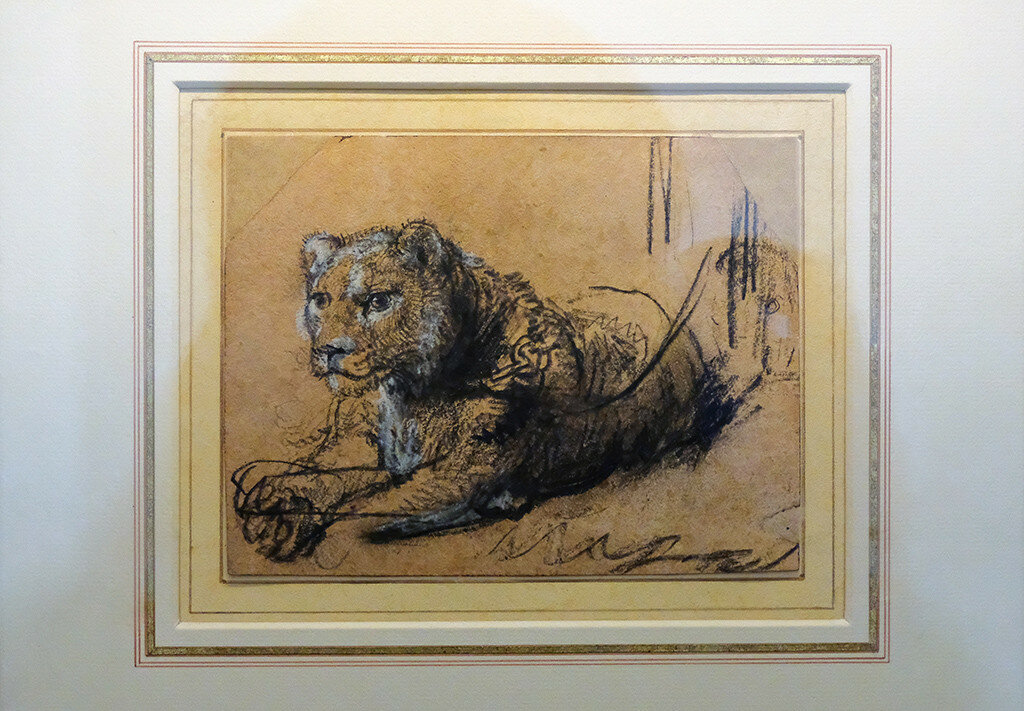 НачалоПродолжим осмотр Лейденской коллекции. В Белом зале кроме восьми уже показанных картин Рембрандта, представлены ещё три его ранние работы и один рисунок.Именно с этого рисунка с молодым львом началась Лейденская коллекция. Рембрандт нередко делал наброски животных, когда они попадались ему на глаза. А потом, пользуясь набросками, памятью и воображением, в мастерской включал их в свои картины или гравюры