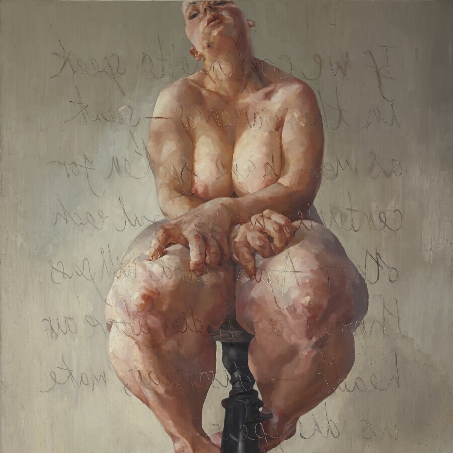 Jenny Saville made “Propped” in 1992 as a self portrait. It was initially made to be part of Saville’s degree exhibition at the Glasgow School of Art in Edinburgh, where it was subsequently acquired by the collector Charles Saatchi. The piece was also featured on the cover of the Times Saturday Review. Sotheby’s auction house called the work “One of the most important paintings by a British artist of the last thirty years.” “Propped,” depicts the artist herself, in the nude, quite literally propped atop a stool, gazing wistfully into a mirror. Saville’s body is fleshy and large; her hands grip opposite knees, drawing her breasts close together; her feet are crossed and tucked behind the stool. Her head is tilted upwards, partially out of the frame, where it looks almost miniscule next to her thighs, which are nearly double its size. Scrawled across the mirror is a quote by the feminist writer Lucy Irigaray which reads “if we continue to speak in this sameness — speak as men have spoken for centuries, we will fail each other.” For Saville, incorporating text into her artwork is rare— there are only two paintings in which she does so, this being one of them.