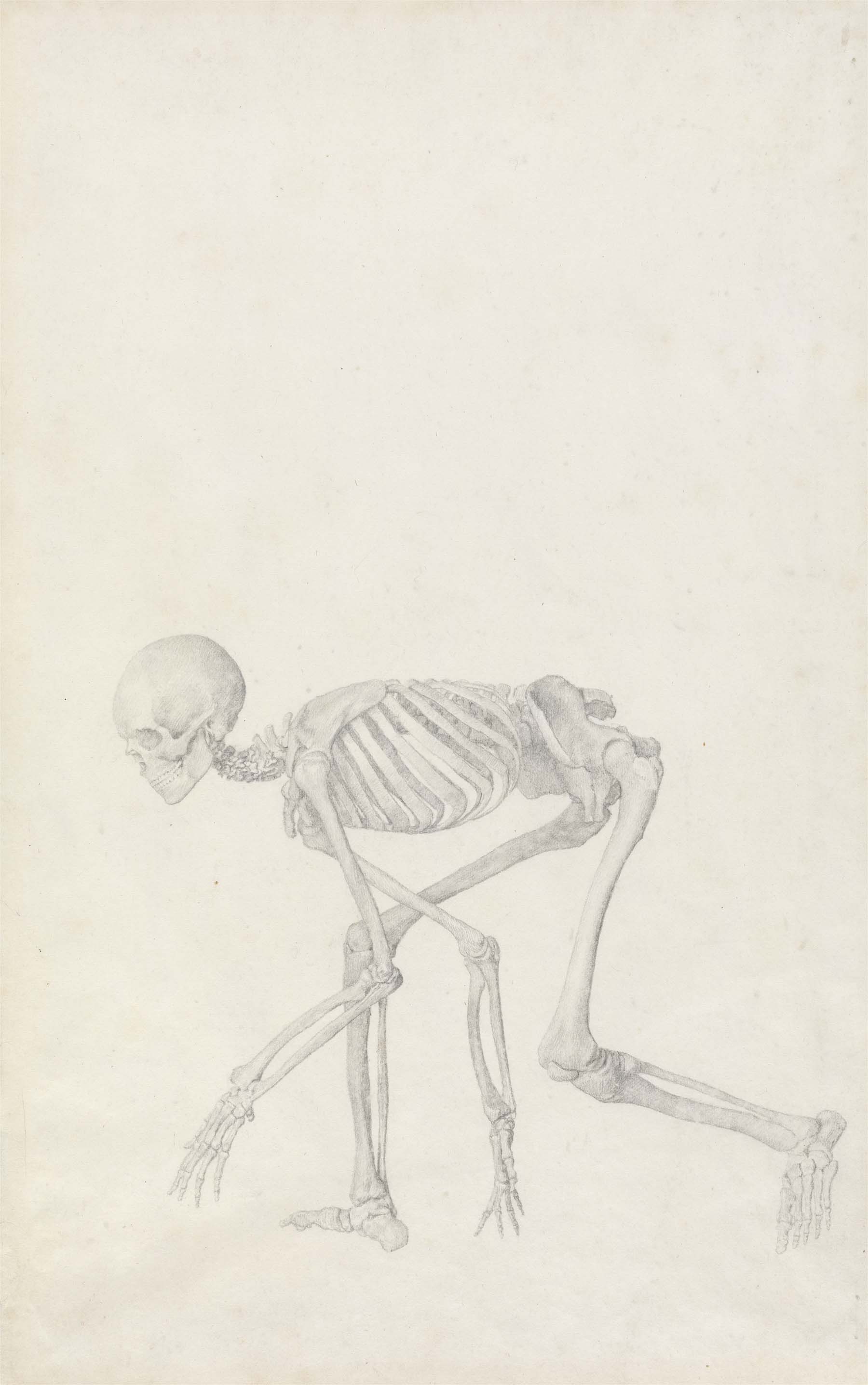 Human skeleton lateral view in crouching posture finished study for an unpublished table. Yale Center for British Art, Paul Mellon Collection