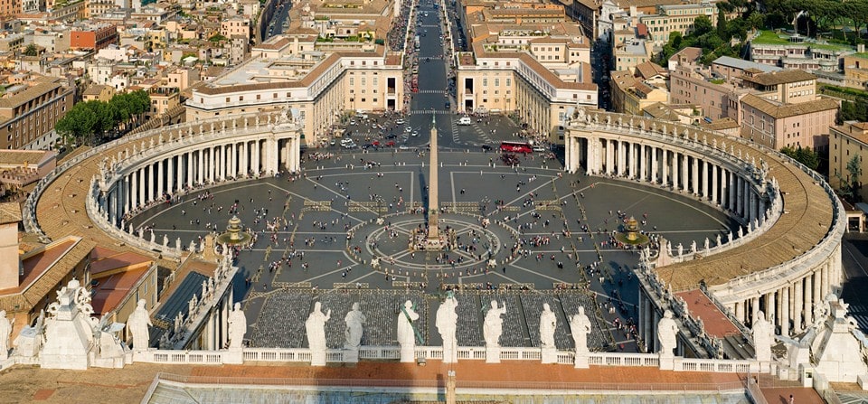 Строительство площади длилось 11 лет, закончено в 1667 г. С обоих сторон площади разместились коллонады, как символ обнимающих землю церковных рук. Колонны 20-метровой высоты шириной 1,6 метра установлены в 4 ряда. Всего насчитывается 284 колонны, 140 из них украшены расположенными сверху статуями религиозных лиц. С правой и с левой стороны от главного обелиска площади есть пластины из мрамора, встав на которые можно увидеть лишь 1 ряд колонн. Бернини хорошо знал геометрию.