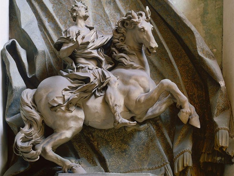 Конная статуя Константина –скульптура создавалась с 1654 г. по 1670 г. и была заказана Иннокентием X. Когда к власти пришел Клемент X (Clemens X), он установил статую перед лестницей папского дворца. Константин (Constantinus) Великий перед битвой с Максенцием (Maxentius) увидел на земле символ из креста и надписи: «сим побеждай». Военачальник и солдаты испугались увиденного, но ночью Константину приснился Христос, повелев ему сшить знамя с увиденным днем знаком. Царь послушался видения и войско победило врага. Сейчас статуя находится в соборе святого Петра.