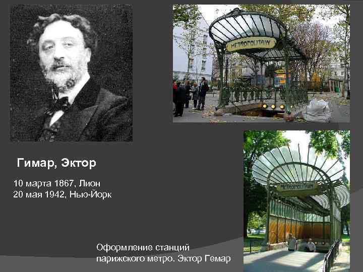 Французский архитектор Гектор (Эктор) Гимар снискал мировую славу, став основоположником модернизма во Франции. Его наиболее известной работой считаются входы в метро Парижа. На фоне окружающей застройки их отличает цветочный орнамент, плавность линий, использование символики и криволинейные формы.