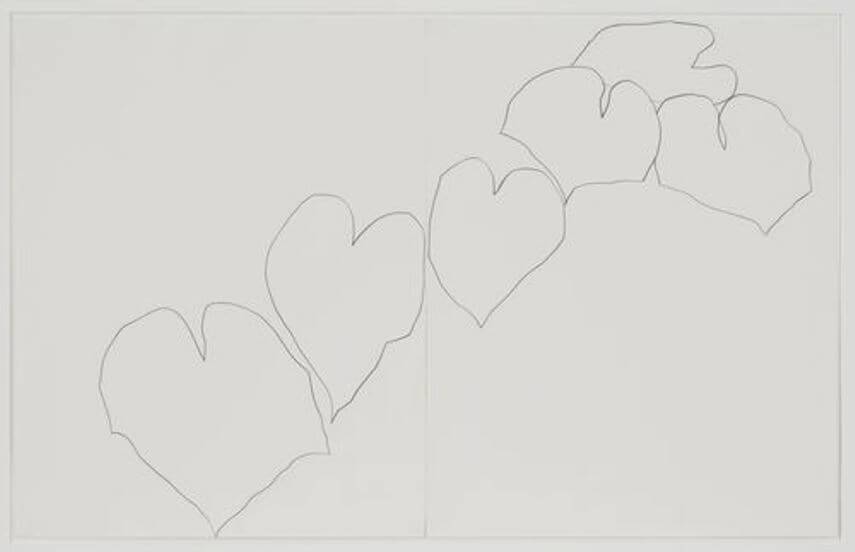 In the 1960s he made a series of drawings of various wild fruits, garden vegetables, trees, branches and the leaves and flowers of various other plants. His 1960 drawing titled Wild Grape reduces the leaves of the wild grape plant to their simplest forms. In his 1962 painting Red White, Kelly takes that exact form and inverts it onto a white canvas.
