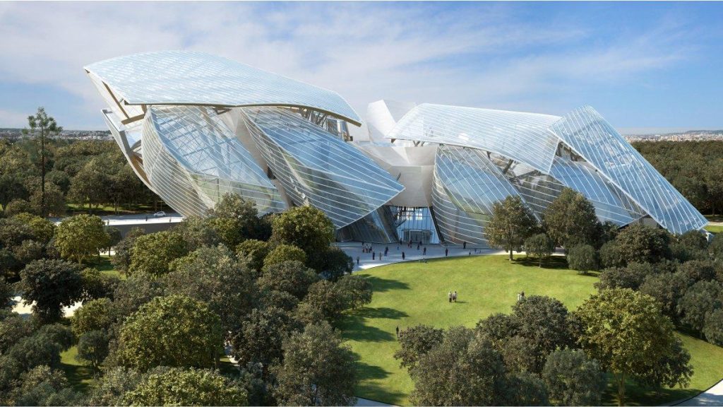 Здание было построено в 2014 в Булонском лесу Франции. Конструкция представляет собой строение из белых каменных блоков, которые выглядят как большой айсберг. А фасад состоит из стеклянных панелей в виде парусов. Он дает свету и природе отражаться на поверхности стен, рисуя на нем узоры. А внутри здание состоит из обширных зеркальных помещений.