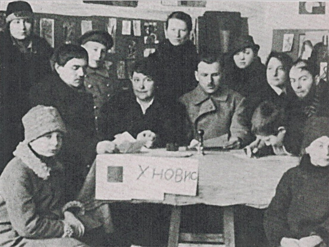 Занятия в мастерской Уновиса. Сентябрь 1920 года. Справа налево: на переднем плане — Иван Червинко, Георгий Носков, Михаил Векслер, Н. Фейгельсон; над ними — Ефим Рояк; сидит — Николай Суетин; за столом — Лев Юдин, Нина Коган, Вера Ермолаева; у доски стоит Казимир Малевич, рядом — Лазарь Хидекель, Илья Чашник. Фотография: thecharnelhouse.org