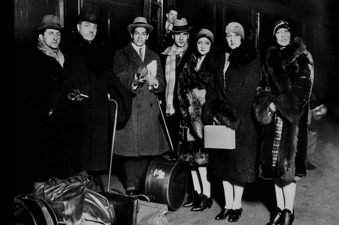 На вокзале — композитор Роже Дезормьер, Сергей Дягилев, танцовщик Серж Лифарь, писатель и театрал Борис Кохно, балерины Александра Данилова, Фелия Дубровская и Любовь Чернышева. Фотография: persons-info.com