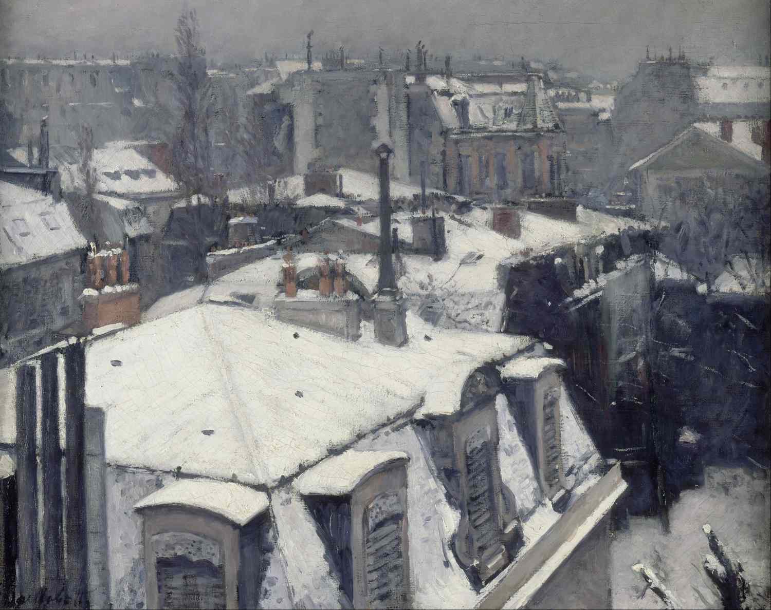 The artwork titled «View Of Rooftops (snow)» by Gustave Caillebotte, created in 1878, is an exquisite oil on canvas measuring 64 x 82 cm. Currently housed in the Musée d’Orsay in Paris, the artwork depicts a serene yet melancholic snowy landscape of urban rooftops. The muted, cool tones capture the quietude and stillness of a winter day, showcasing Caillebotte’s meticulous attention to the play of light on snow and architectural details. The scene embodies the essence of a crisp winter morning, offering a captivating glimpse into 19th-century Parisian life.