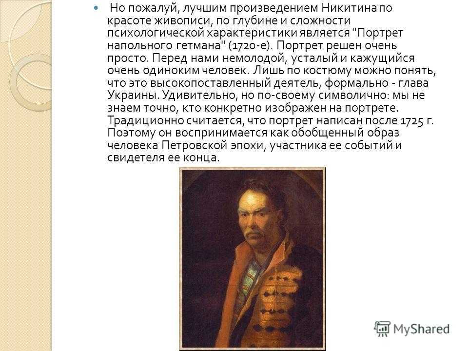 Но пожалуй, лучшим произведением Никитина по красоте живописи, по глубине и сложности психологической характеристики является » Портрет напольного гетмана » (1720- е ). Портрет решен очень просто. Перед нами немолодой, усталый и кажущийся очень одиноким человек. Лишь по костюму можно понять, что это высокопоставленный деятель, формально — глава Украины. Удивительно, но по — своему символично : мы не знаем точно, кто конкретно изображен на портрете. Традиционно считается, что портрет написан после 1725 г. Поэтому он воспринимается как обобщенный образ человека Петровской эпохи, участника ее событий и свидетеля ее конца.