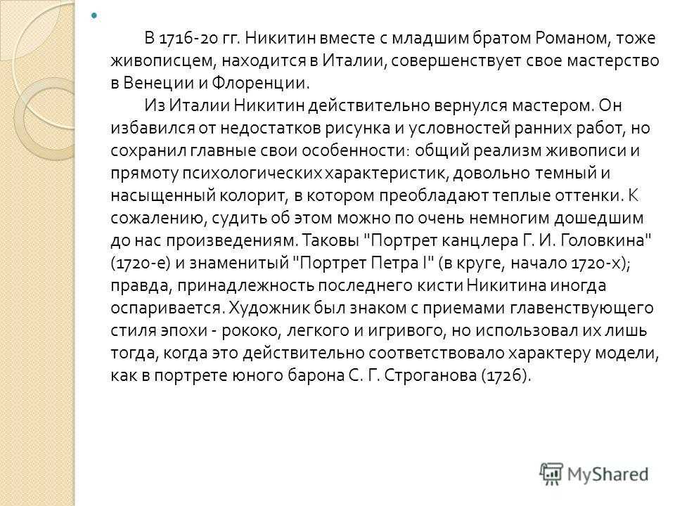 В гг. Никитин вместе с младшим братом Романом, тоже живописцем, находится в Италии, совершенствует свое мастерство в Венеции и Флоренции. Из Италии Никитин действительно вернулся мастером. Он избавился от недостатков рисунка и условностей ранних работ, но сохранил главные свои особенности : общий реализм живописи и прямоту психологических характеристик, довольно темный и насыщенный колорит, в котором преобладают теплые оттенки. К сожалению, судить об этом можно по очень немногим дошедшим до нас произведениям. Таковы » Портрет канцлера Г. И. Головкина » (1720- е ) и знаменитый » Портрет Петра I» ( в круге, начало х ); правда, принадлежность последнего кисти Никитина иногда оспаривается. Художник был знаком с приемами главенствующего стиля эпохи — рококо, легкого и игривого, но использовал их лишь тогда, когда это действительно соответствовало характеру модели, как в портрете юного барона С. Г. Строганова (1726).