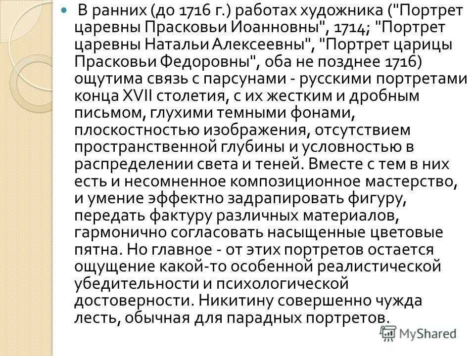 В ранних ( до 1716 г.) работах художника (» Портрет царевны Прасковьи Иоанновны «, 1714; » Портрет царевны Натальи Алексеевны «, » Портрет царицы Прасковьи Федоровны «, оба не позднее 1716) ощутима связь с парсунами — русскими портретами конца XVII столетия, с их жестким и дробным письмом, глухими темными фонами, плоскостностью изображения, отсутствием пространственной глубины и условностью в распределении света и теней. Вместе с тем в них есть и несомненное композиционное мастерство, и умение эффектно задрапировать фигуру, передать фактуру различных материалов, гармонично согласовать насыщенные цветовые пятна. Но главное — от этих портретов остается ощущение какой — то особенной реалистической убедительности и психологической достоверности. Никитину совершенно чужда лесть, обычная для парадных портретов.