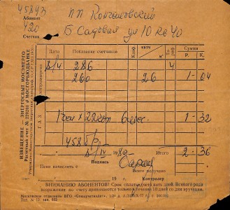 Счет за электроэнергию мастерской № 40. 1980 год. Мастерская еще числилась за Петром Петровичем Кончаловским, хотя он умер в 1956 году, и в 1980 году там работал его сын Михаил. Из собрания Музея М. А. Булгакова