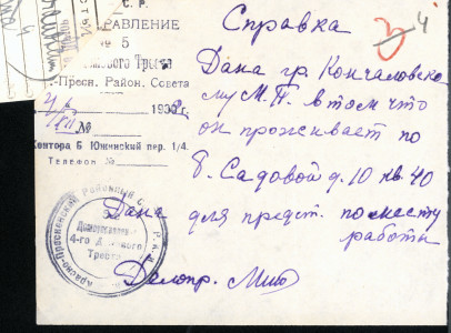 Справка Михаила Петровича Кончаловского. 1932 год. РГАЛИ. Ф. 648. Оп. 1. Ед. хр. 1530. Л. 4