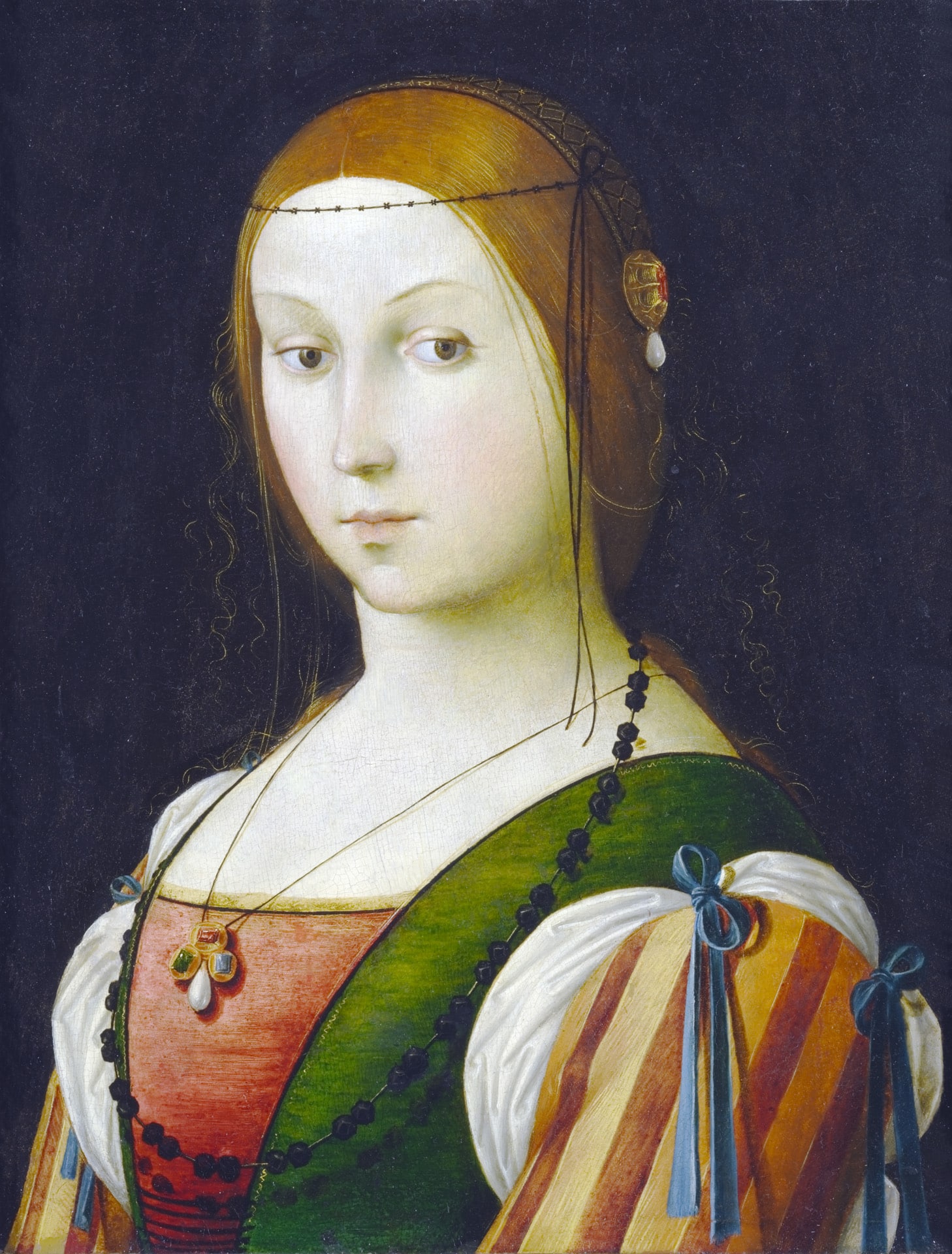 The identity of the sitter is unknown, but it is clear from her appearance and the fact that she was painted by a prominent artist by Lorenzo Costa that she is a lady of high standing. She was once thought to be Eleonora Gonzaga (1493–1550), but the likely date of the painting would be too early. Her mother, Isabella d’Este (1474–1539), a formidable art patron and powerful political figure, has also been identified as the subject, although she would appear to be too old for a work made in 1505. Because the artist lived in Ferrara from 1499 to 1506, it seems plausible that the sitter was associated with the ruling Este family, or the Bentivoglio family of Bologna.