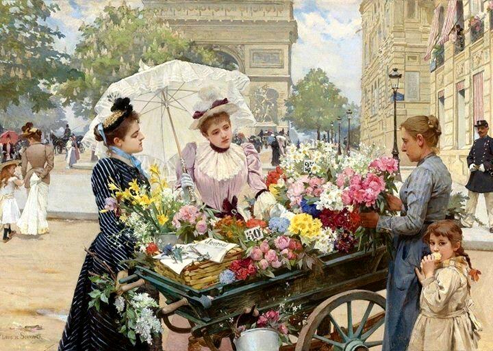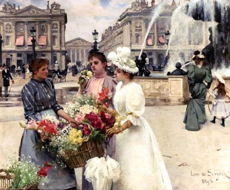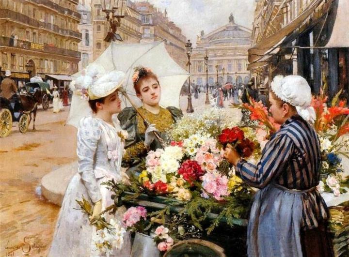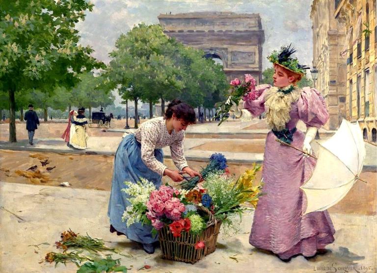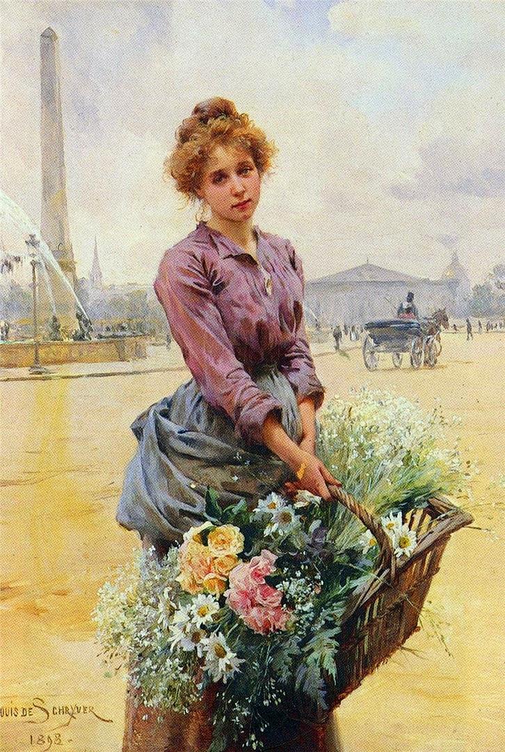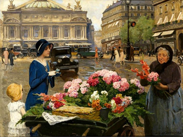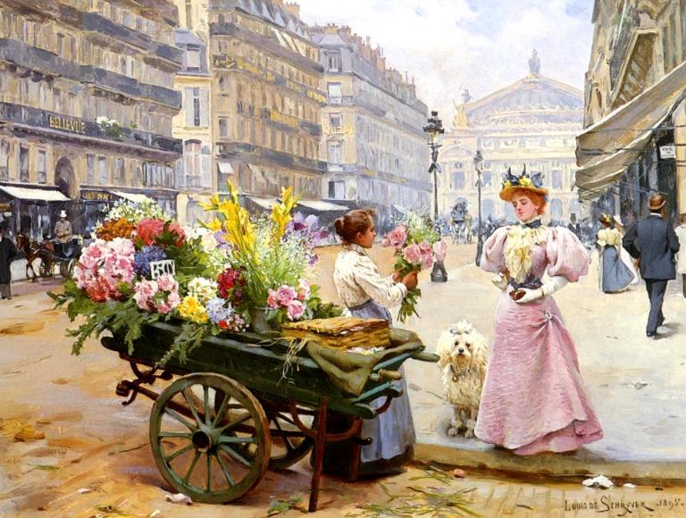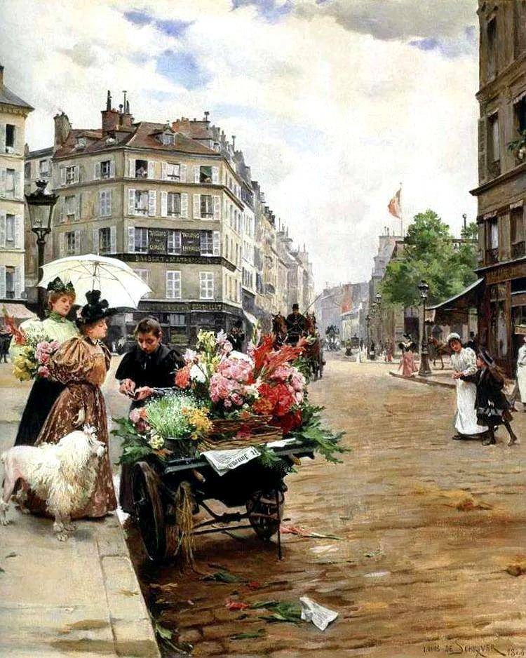 For many years, Louis Marie de Schryver painted Paris’s streets, flowers, and beautiful Parisian ladies. Yes, there was one «deviation» from the primary topic — when the first vehicles appeared, the artist was intrigued by their mechanical beauty, and he depicted races and cars on the streets of Paris. The audience, however, did not share the Louis Marie de Schryver’s new interest, and he was compelled to return to his flower girls, flower markets, and cheerful Parisian women. Until his death in December 1942, at the age of 80, the artist created lovely flowers and attractive women.