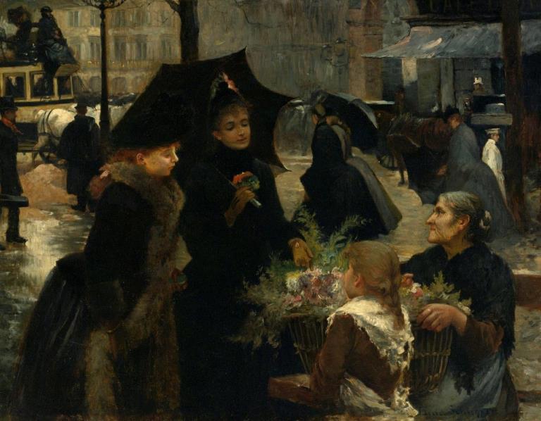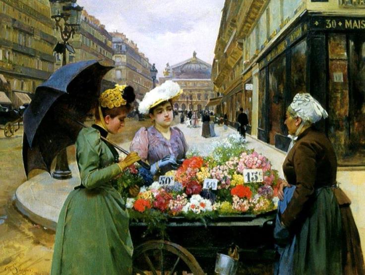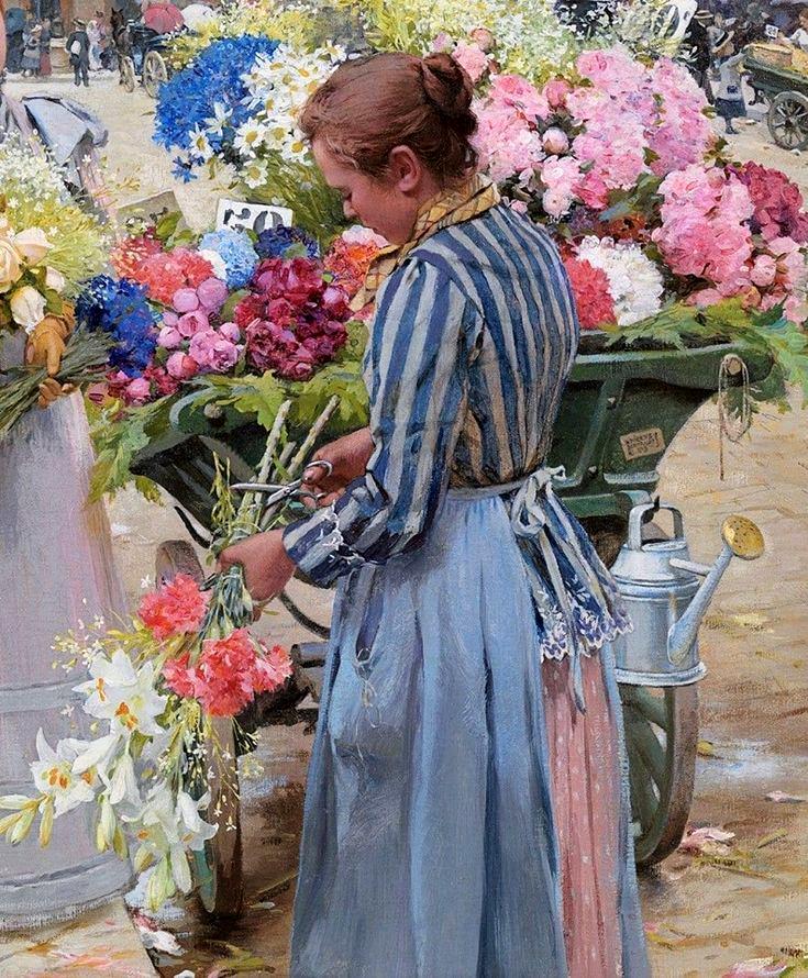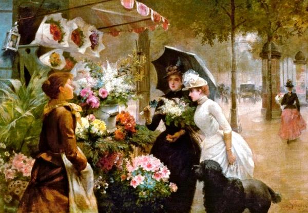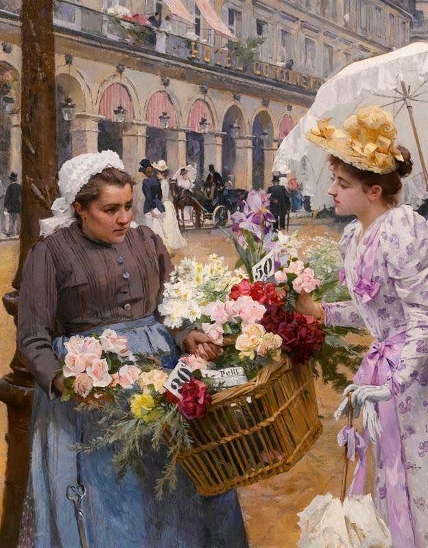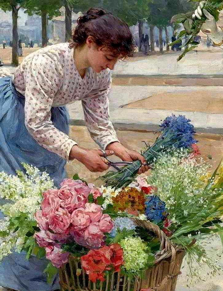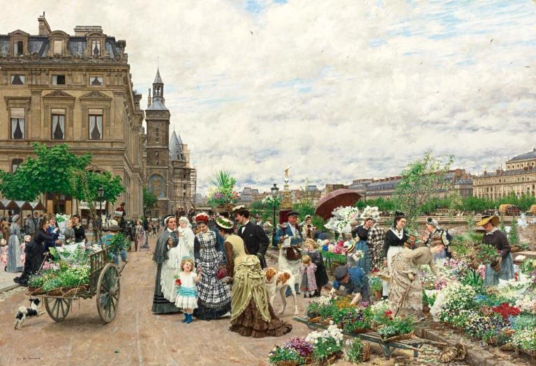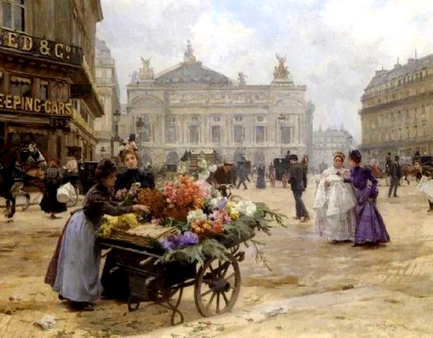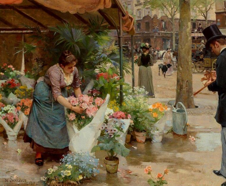For many years, Louis Marie de Schryver painted Paris’s streets, flowers, and beautiful Parisian ladies. Yes, there was one «deviation» from the primary topic — when the first vehicles appeared, the artist was intrigued by their mechanical beauty, and he depicted races and cars on the streets of Paris. The audience, however, did not share the Louis Marie de Schryver’s new interest, and he was compelled to return to his flower girls, flower markets, and cheerful Parisian women. Until his death in December 1942, at the age of 80, the artist created lovely flowers and attractive women.