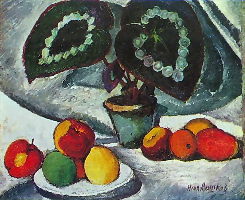 Картины Машкова начала ХХ века – сочные, яркие, многоцветные, дающие зрителю почувствовать восторг и пыл художника, склонного к простоте и ясности форм. Налицо пристрастие к чистым интенсивным цветам и выразительной красочности изображаемого. Будь то натюрморт с преувеличенно замечательными фруктами и ягодами, или портрет человека в одежде насыщенных оттенков, который изображён на расписном фоне. Ценители живописи, современники Машкова, находили в его картинах «радость дикаря», но многие и ругали художника, не понимали. В 1910 году Машкова исключили из училища. Но после всё было с лихвой компенсировано: он выставляет 10 картин в Салоне, который демонстрирует их в Санкт-Петербурге, Киеве, Одессе, Риге. Затем везёт свои работы в Париж на Осенний салон, после которого натюрморт «Синие сливы» купил известный коллекционер И.А. Морозов.