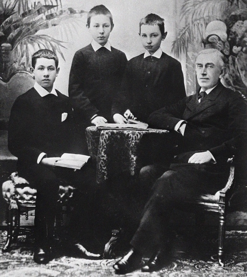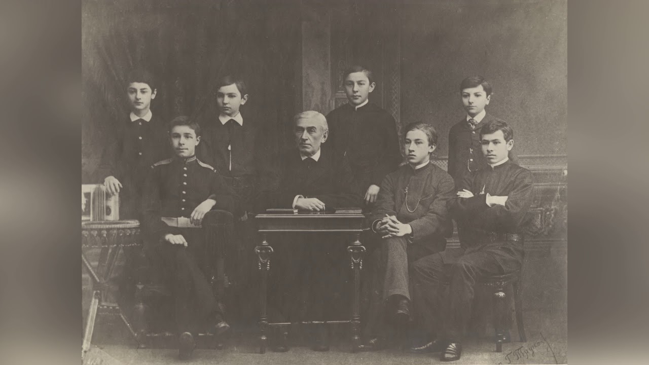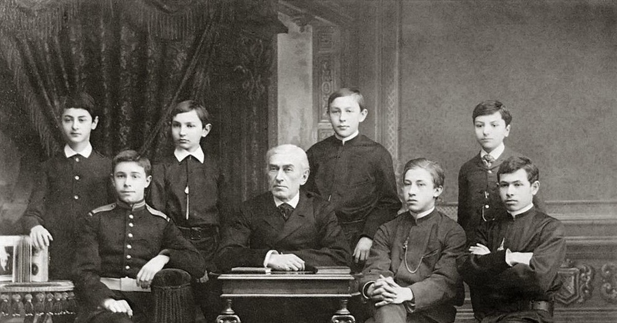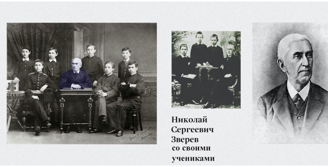Зверев (в центре) и размещенные им студенты (слева направо) Самуэльсон, Скрябин, Максимов, Рахманинов, Черняев, Кенеман и Прессман.
