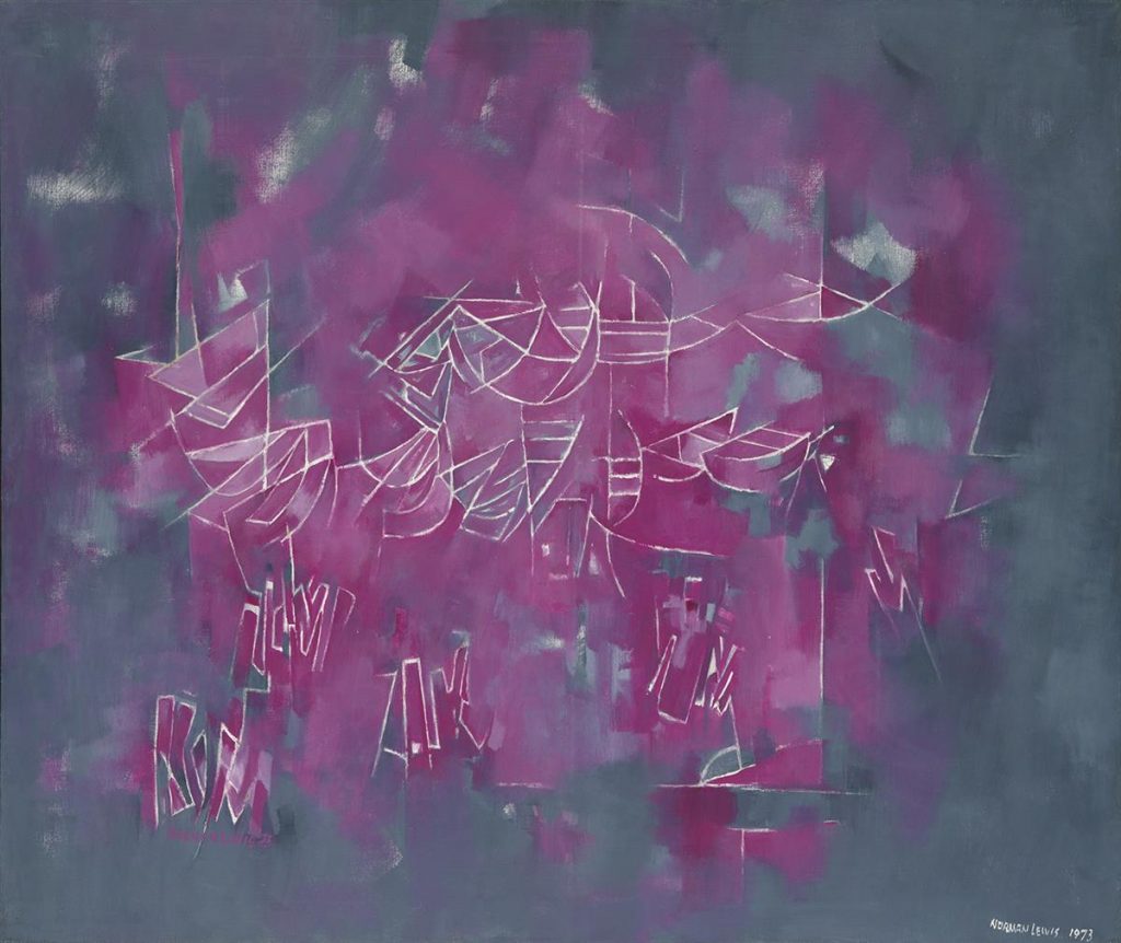 One of the most distinctive aspects of the abstract painting style that Lewis developed is his use of line. His brush strokes are wispy and energetic, even lyrical, and yet they possess an architectonic structure that endows them with a sense of strength and weight. He employed this element in such a way that his lines created relationships with each other, implying the presence of forms rather than describing literal objects in space. In paintings like “Street Musicians” (1948), a congregation of lines occupies the center ground of the canvas, surrounded by a pinkish, atmospheric haze. The painting is fully abstract, and yet because of the way the space is divided it seems as though it is a picture of something recognizable. The linear patterns in the middle of the canvas suggest the appearance of actual musicians, perhaps shattered into a Cubist multi-verse of perspectives and planes. But this is not a picture of musicians. This is more of an expression of the the energy and emotion of music played on the street; the excitement of notes piercing space, and the carnival of colors and sounds as they fill the air.