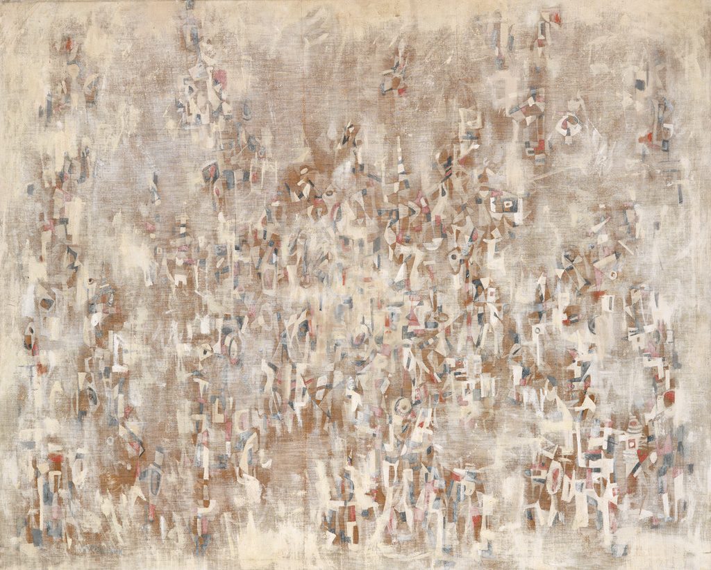 A large oil on canvas dating to about 1958 was rediscovered in 2015. A masterful midcentury composition that had never been publicly exhibited, it revealed yet another dimension to his late-1950s body of abstraction—a series of larger canvases that he painted after a trip to Europe and North Africa in 1957. In this painting, Lewis continued his investigation of “ritual” calligraphic figures while moving further toward color field painting. Here, Lewis both reveals and obscures a large, dense composition of his figures with a limited palette by deftly balancing the warm beige color of the linen canvas with washes of a warm white. The figures, comprised of more modernist shapes, and less of his frenetic calligraphic line, confirm Lewis’s inspiration from his European experience.