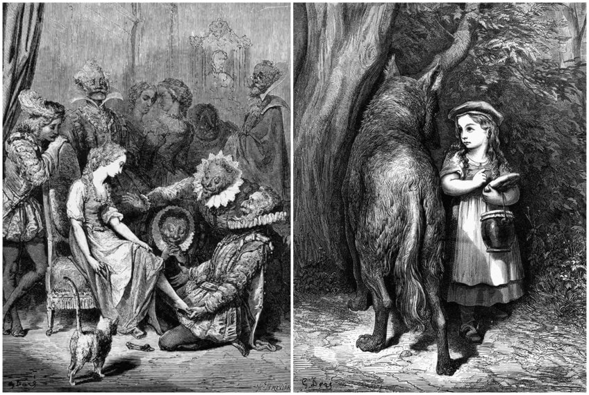 LEFT: Untitled illustration from “Cinderella” from the book Les Contes de Perrault, an edition of Charles Perrault’s fairy tales illustrated by Gustave Doré, originally published in 1862. Here, the prince lets the titular character try on the glass slipper; Gustave Doré, Public domain, via Wikimedia Commons | RIGHT: “Red Riding Hood meets old father wolf”. An untitled illustration from Les Contes de Perrault, an edition of Charles Perrault’s fairy tales illustrated by Gustave Dore, originally published in 1862; Gustave Dore, Public domain, via Wikimedia Commons