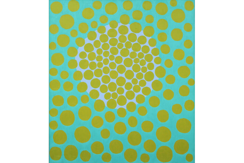 After completing his Masters at Yale, Anuszkiewicz took the unusual step of returning to Ohio to earn an additional degree in education in case he ever wanted to teach. It was there, finally free from the influence of Albers, that he arrived at a style of his own. It was an exploration of how the relationships between colors and shapes could fool the eye and make the mind see things that are not there. He found this experience transcendent and contemplative, and its paradox poetic. After completing his education degree, Anuszkiewicz felt that for the first time he had a strong, idiosyncratic idea, and plenty of good examples of his work. So he moved to New York and began showing his work to gallerists. But despite many who thought the work intriguing, no gallerists wanted to take a chance on showing it. It was 1957. Abstract Expressionism was still the rage. Dealers just were not sure whether the flat, colorful, hard-edge works Anuszkiewicz was making would sell.