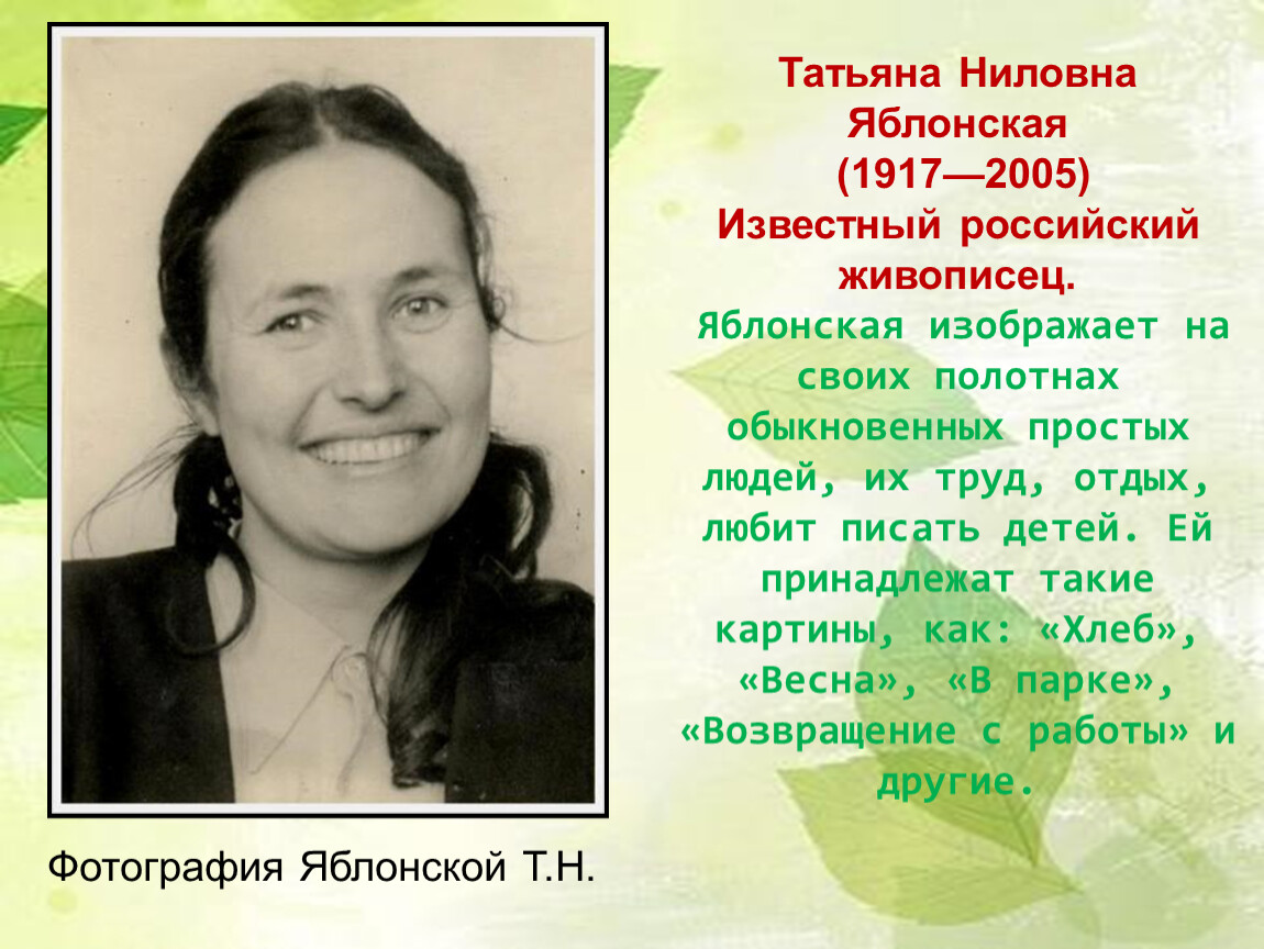 Наиболее известны картины Яблонской под названиями:
