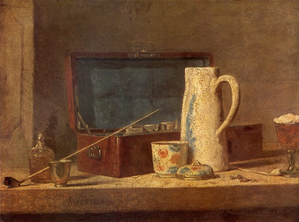 Шарден, как и лучшие голландские мастера, в своих натюрмортах умел передавать очарование простых предметов домашнего обихода, которые окружают любого человека. Будь то кувшины, кастрюли, кадки, бочки для воды, фрукты и овощи, иногда, атрибуты искусств и науки. Натюрморты мастера не отличаются пышностью и обилием вещей. Все предметы скромны и не бросаются в глаза, но прекрасно и гармонично сочетаются друг с другом.