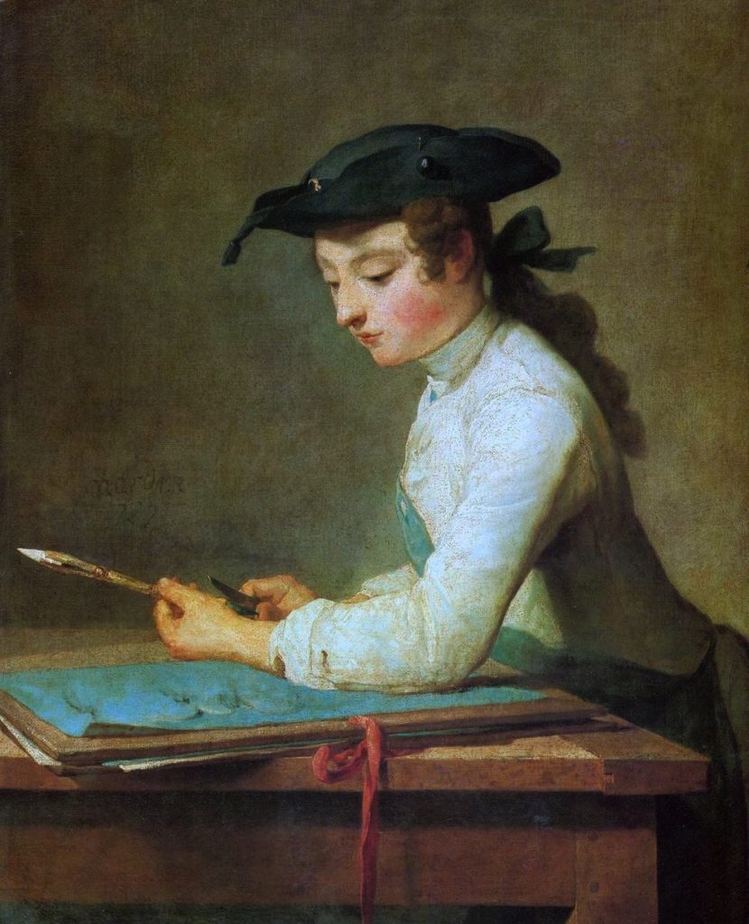 Художник, 1737. Холст, масло, 81*64 см. Лувр, Париж. По примеру голландских художников XVII века Шарден писал детские портреты в спокойных тонах, подчеркивая непринужденность изображенных на них сцен. Юный художник, представленный на картине, увлечен работой и полностью погружен в свои мысли. Как и в натюрмортах, художник точно передает суть выбранного момента. Шарден мастерски отображал красоту человека, не затушевывая и не подчеркивая ее дополнительными обстоятельствами.