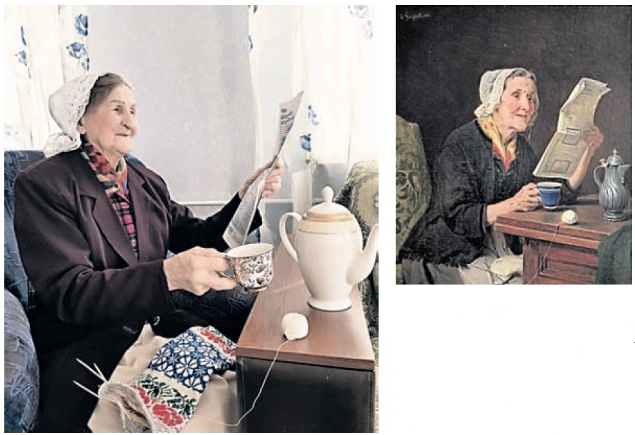 Люба Казачка замахнулась на немецкого живописца Августа Фридриха Зигерта и его работу «Старая женщина с газетой и чашкой кофе». Моделью выступила 83-летняя мама Любы, которую, по утверждению дочери, «очень позабавила идея, но вязаный носок она выбрала самый красивый — из собственных произведений».