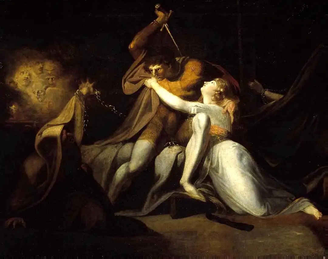 Сюжеты картин Фюзели черпал из литературы и мифологии. Например, художник создал ряд работ по произведениям Шекспира. А если смотреть на творчество Фюзели в целом – для художника характерны фантастические сюжеты, изображение сверхъестественного и мрачная, готическая атмосфера.