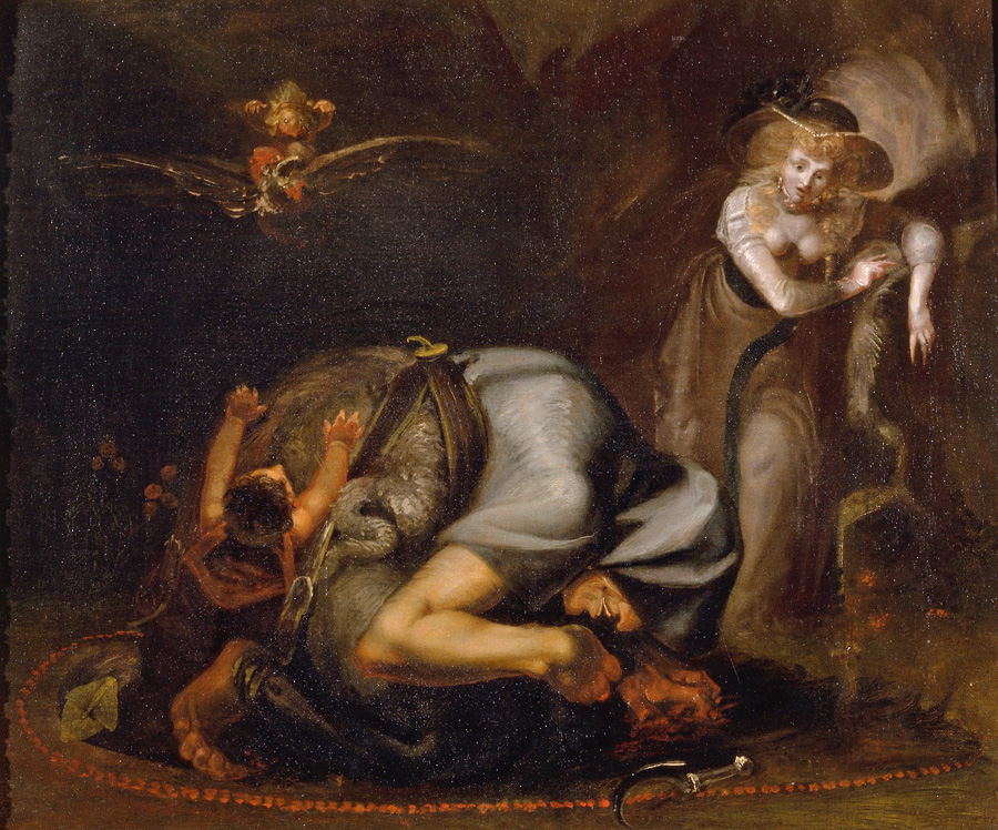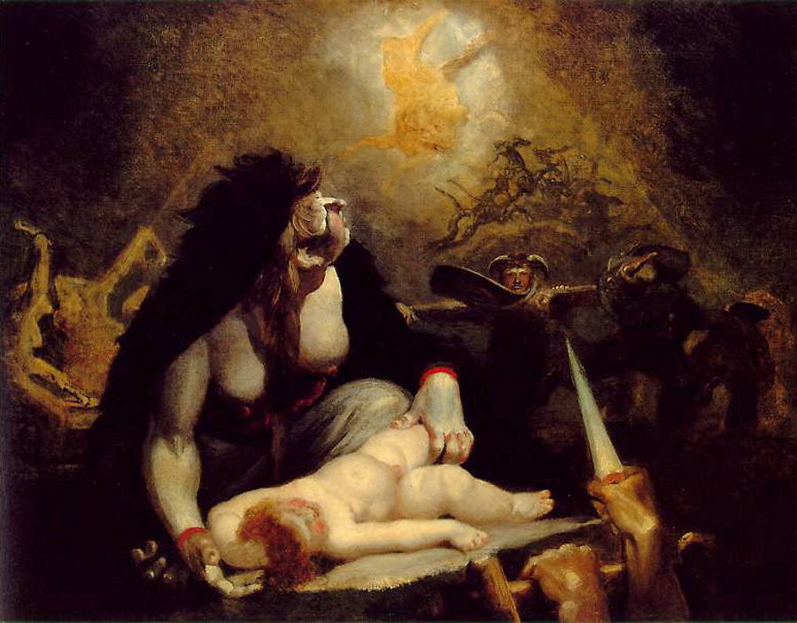 Но не сексуальностью единой. Увлечение живописью эпохи Возрождения и античные мотивы присутствовали во многих в его работах. Как и мистицизм, всевозможные знаки и символы — в то время в Англии, открывшей для себя Восток со всеми его премудростями и диковинками, уже входило в моду увлечение сверхъестественным, и Фюссли исправно подливал масла в этот огонь. Правда, на данном поприще куда больших успехов, равно как и признания, добился друг и коллега Генриха — Уильям Блейк. Этим двум господам приписывается чуть ли не главная роль в становлении романтизма в английской живописи.