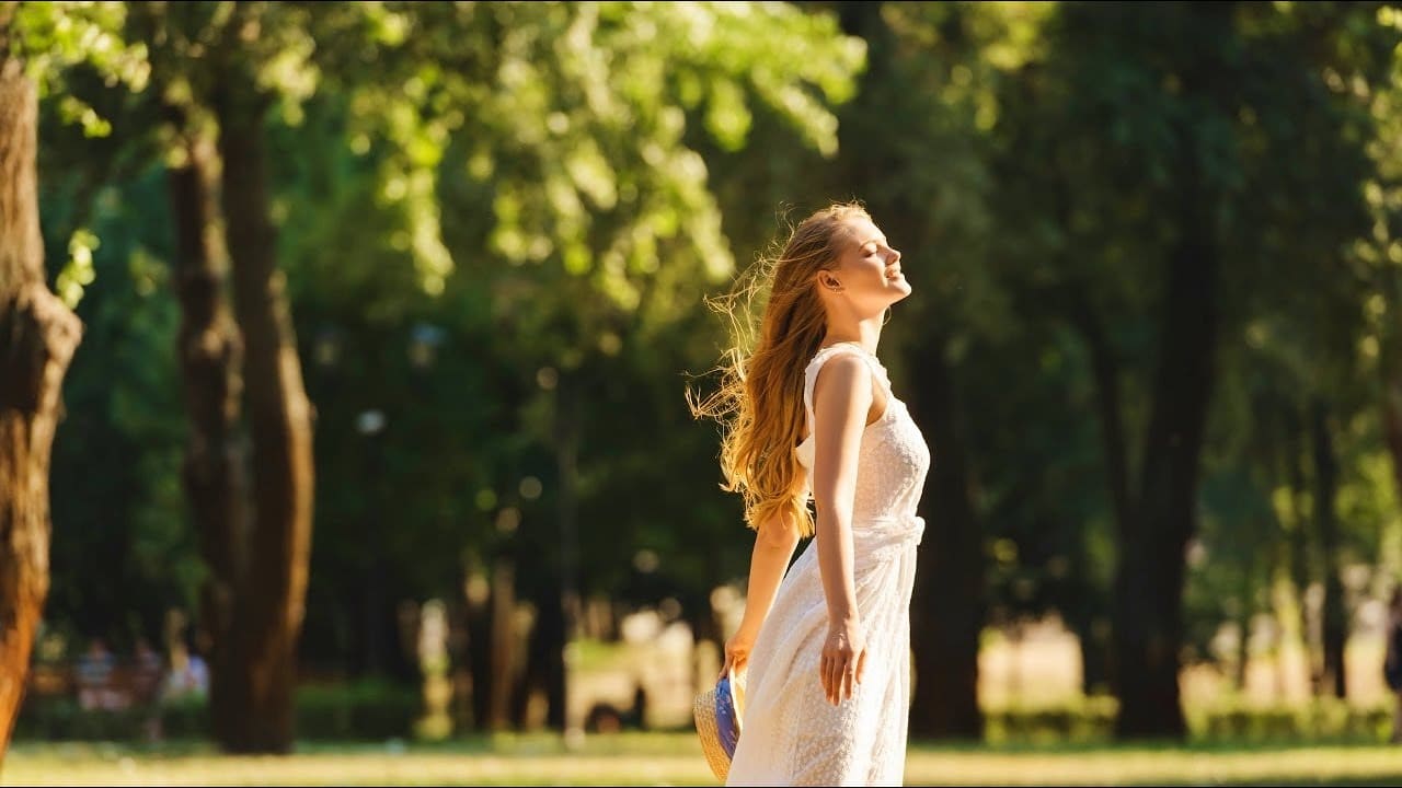 Красота человека. Девушка, гуляющая по богатому зеленью и плодами лесу или по солнечному летнему парку дарит радость и эстетическое наслаждение. Красивая внешность подчеркивает здоровье и благополучие героини изображения.