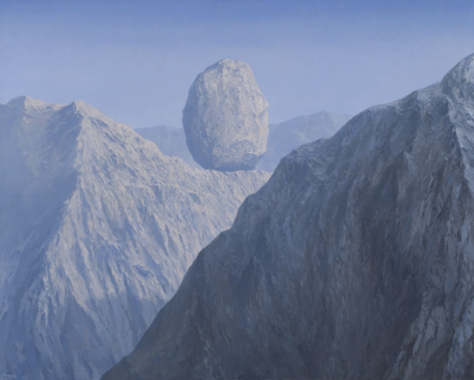 На картине огромный камень грациозно расположился над массивной горой — и этот простой образ очищает голову от навязчивых неприятных мыслей.