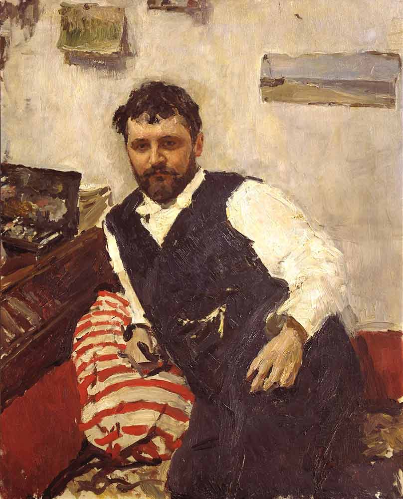 Когда вернулись в Москву, сняли себе мастерские. Беспечный Коровин снял комнату, которая не отапливалась. Под полом жил мышонок, он выходил из своей норки, кормился с рук веселого художника. В мастерской редко кто наводил порядок, всюду валялись этюды, палитры, кисти и тюбики с красками. В этой богемной обстановке, столь свойственной характеру Константина Алексеевича, написал Валентин Александрович его портрет. Написал так, как это мог сделать только тот, кто знал Коровина наизусть. Перед зрителем –– умный, красивый, небрежный, лукавый Константин Коровин, душа любой компании, великолепный мастер, кисть которого создала так много солнечных полотен, что его называли Моцартом живописи.