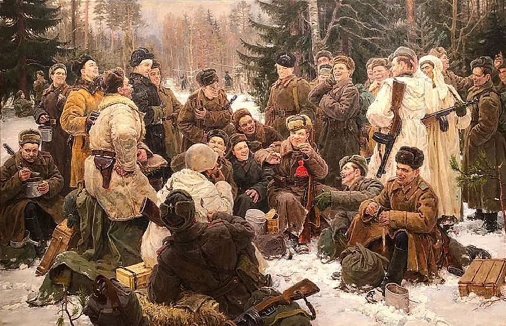 Мужчины расположились прямо на снегу, в окружении хвойных деревьев. Они едят, курят папиросы и рассказывают друг другу увлекательные истории. Оттого на лицах многих солдат сияет улыбка.