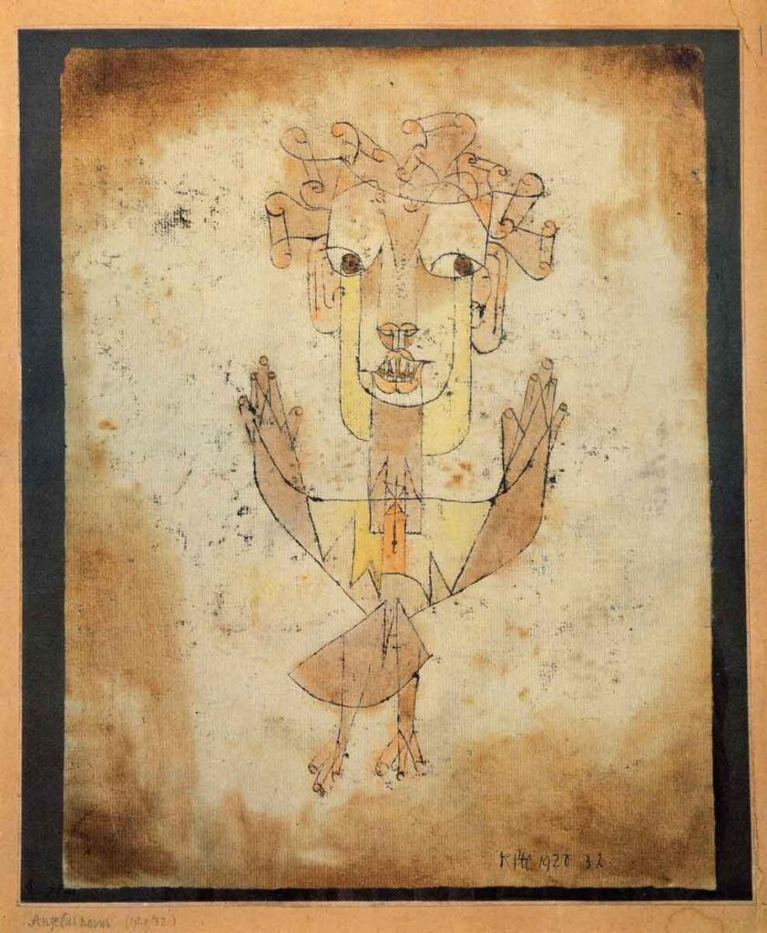 Paul Klee’s Angelus Novus is a work from 1920, showing “an angel, contemplated and fixed on an object, slowly moving away from it,” according to the buyer of the work, German philosopher Walter Benjamin.