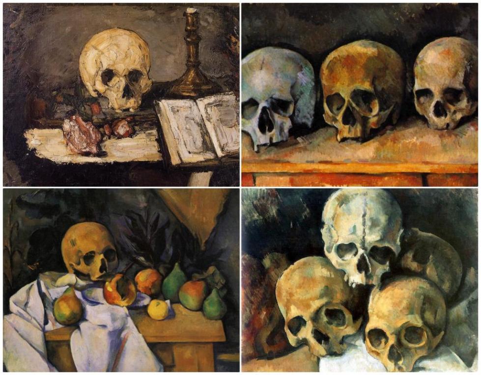 На первом полотне можно увидеть явное подражание художникам барокко — схожи цвета, аллегорические предметы и даже манера. Три другие работы были написаны позже первой, примерно в одно время, и это заметно. В них чувствуется собственный стиль художника, но отсутствие какой-либо привязки к ванитас Возрождения и барокко. «Натюрморт с черепом» Сезанна больше напоминает типичную ученическую постановку натюрморта, в которой он сознательно решил отойти от принятых в ванитас канонов подтекста.