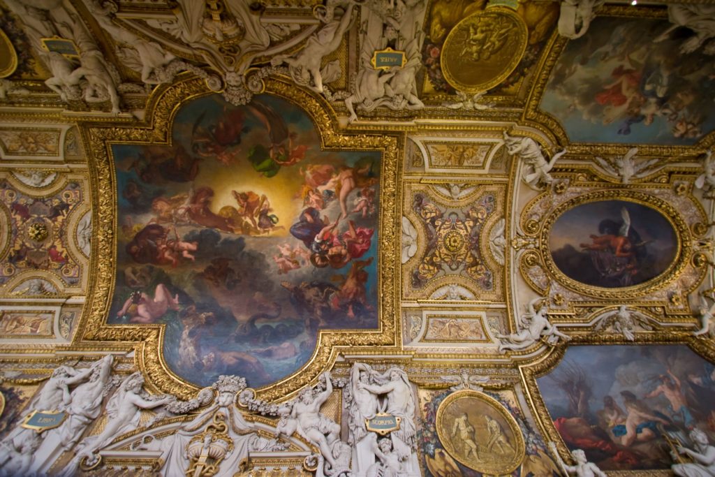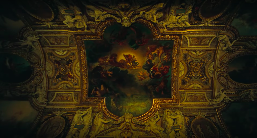 The Jay-Z and Beyoncé Louvre video starts with shots of the Galerie d’Apollon‘s ceiling. At the request of Louis XIV, in 1663 Charles Le Brun painted the race of the sun (Apollo, the Roman god of the sun) through time and space. During the second half of the 18th century, when the Academy of Painting occupied the gallery, the painters Taraval, Durameau, J. J. Lagrenée, Callet and Renou completed the decoration with canvases which were their pieces of reception at the Academy. From 1848 to 1850, the gallery was restored by the architect Duban who commissioned Delacroix to the central composition, and Müller’s and Guichard’s two compositions.