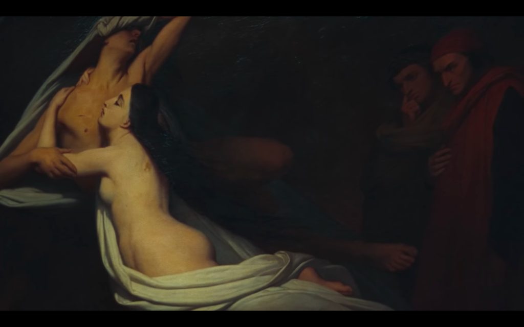 Dante calls out to the lovers and he speaks with Francesca. She obliquely states a few of the details of her life and her death, and Dante, apparently familiar with her story, correctly identifies her by name. He asks her what led to her and Paolo’s damnation, and Francesca’s story strikes such a chord within Dante that he faints out of pity.